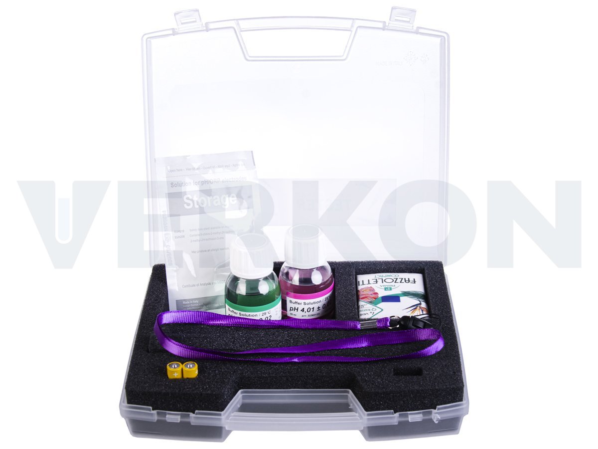 Včetně pufrů pH 4,00 a 7,00, uchovávacího roztoku pro elektrodu, poutka na krk a 2 ks 1,5V AAA baterií