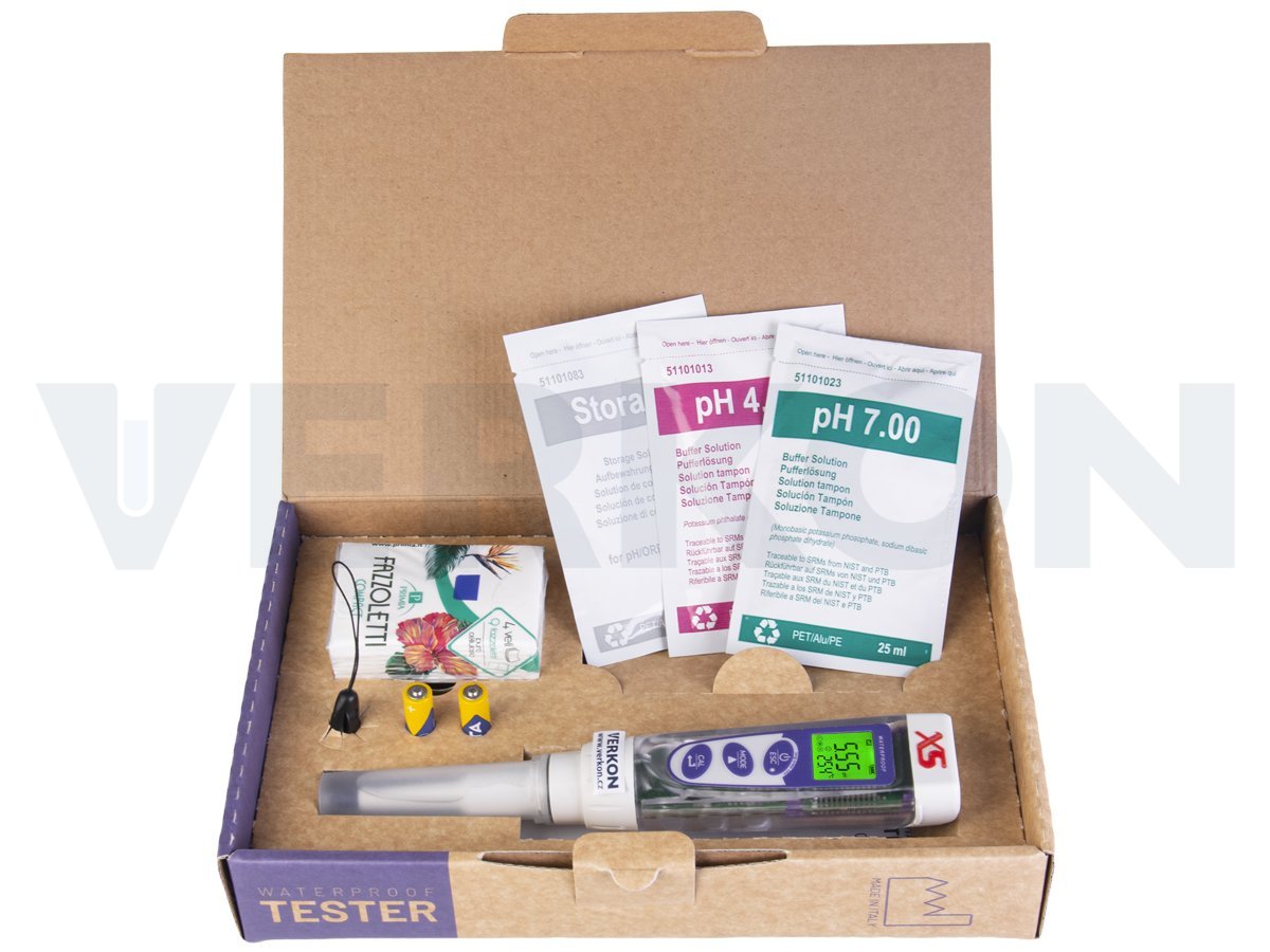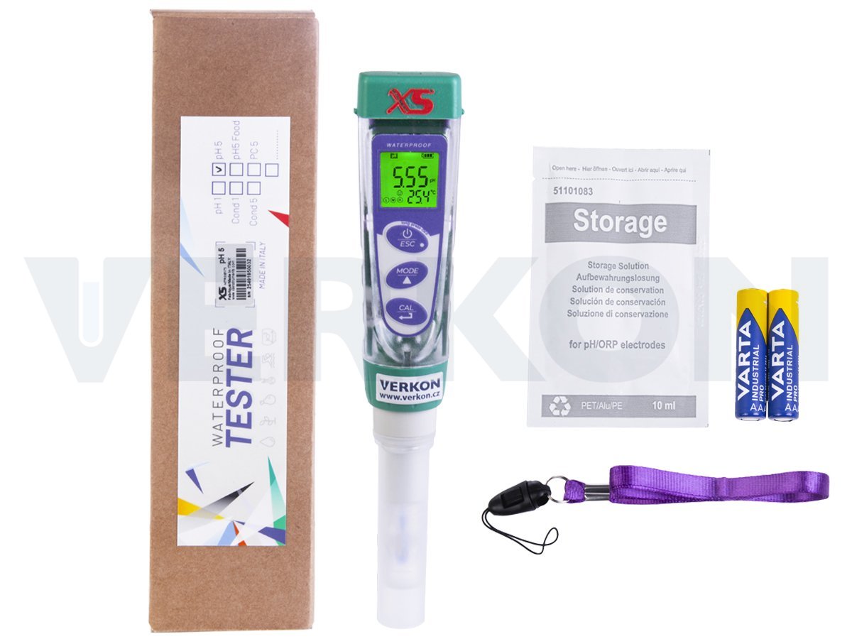 Tester XS pH 5 FOOD je kompaktní přístroj s jednoduchým ovládáním, určený pro rychlé měření pH a teploty. Je vybaven vyměnitelným senzorem zakončeným skleněnou špičkou. Své uplatnění najde zejména v potravinářství. Mezi jeho hlavní výhody patří přehledný LCD displej, který zobrazuje všechny klíčové informace o měření i stavu přístroje a dlouhá výdrž baterií.
