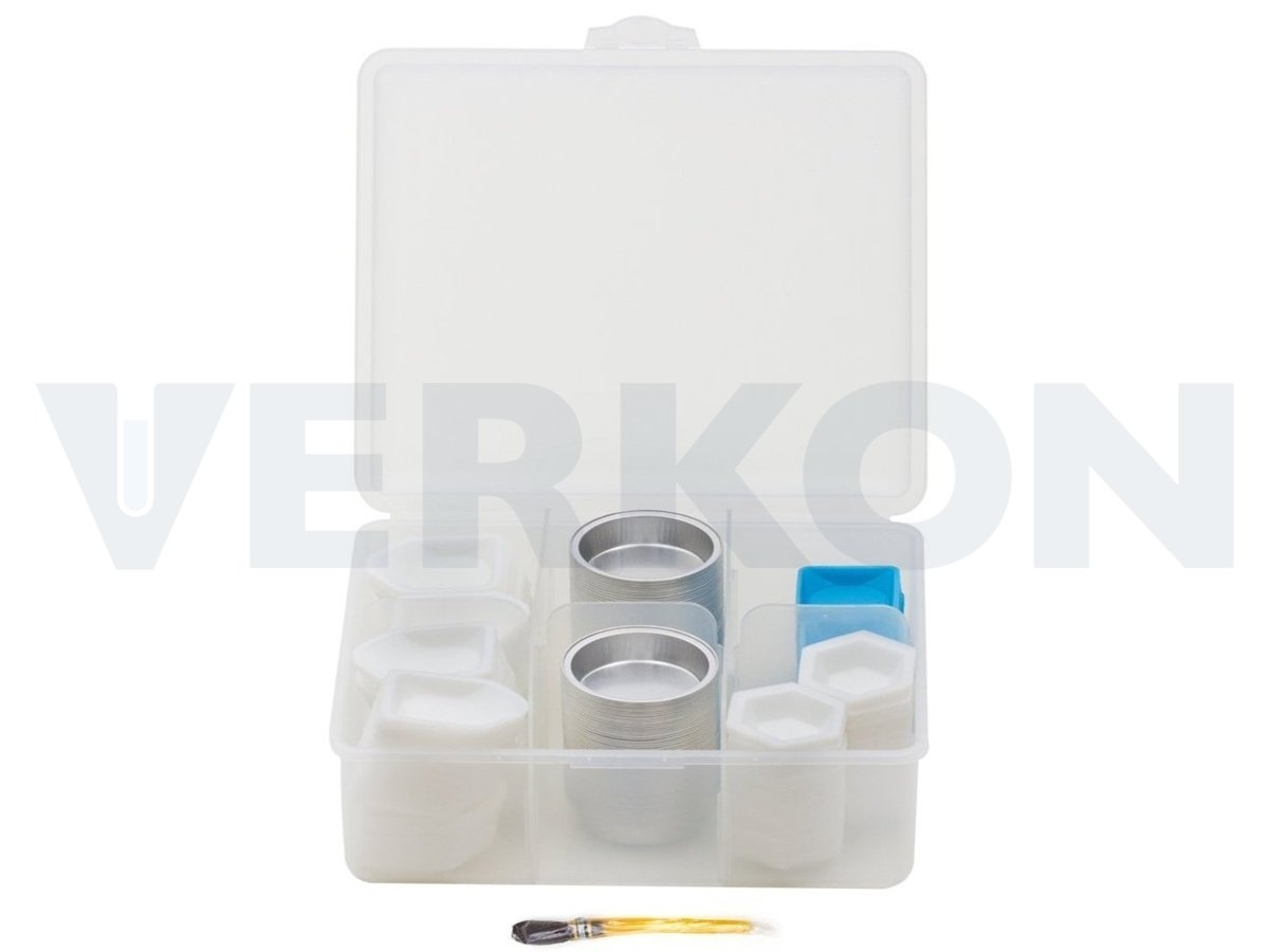 Hliníkové misky, jednorázové váženky, jednorázové lodičky a malý štětec v průhledném plastovém boxu