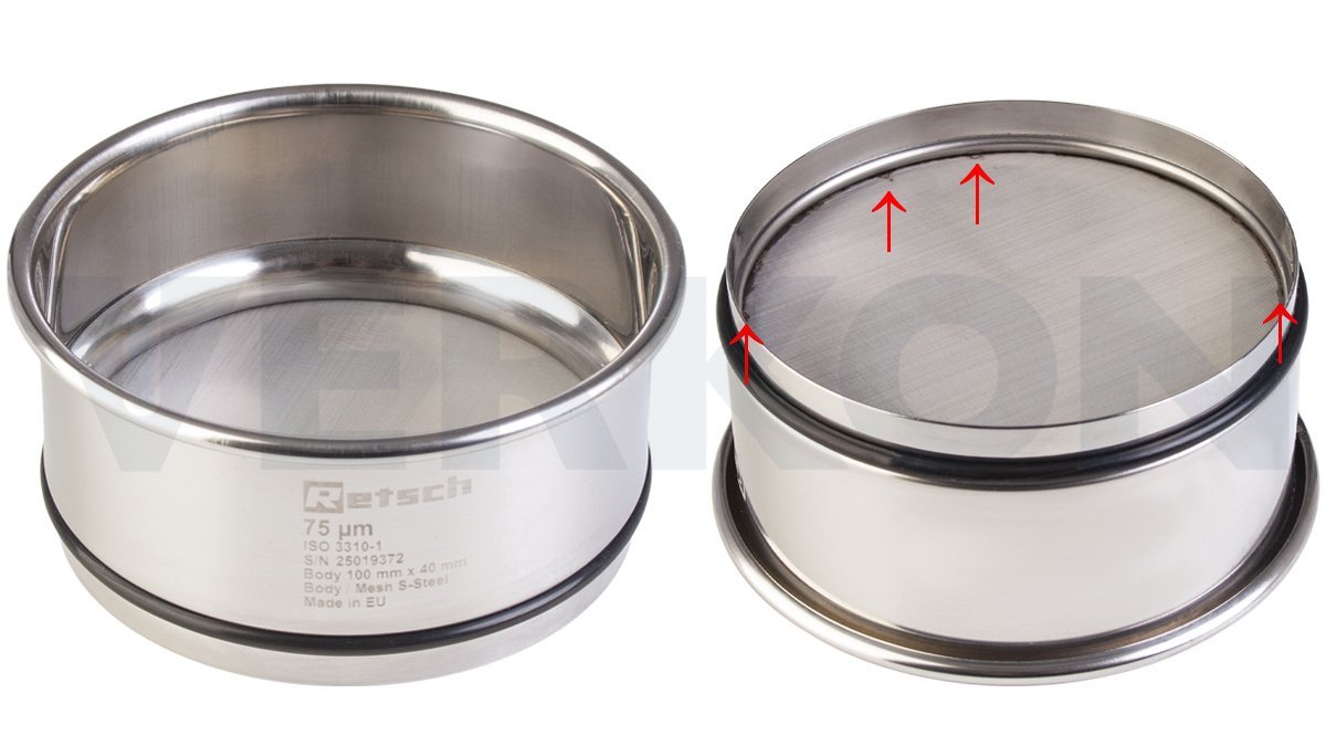 Síto analytické Retsch 100 x 40 mm, třídicí médium drátěná tkanina, nerezový rám, dle ISO 3310-1, Velikost otvorů [mm]: 0,075; Vada: stopy po lepidle v oblasti rámu